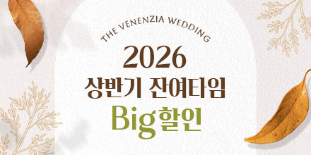 Special Offers 더베네치아의 다양한 이벤트와 혜택을 만나보세요. 26년 상반기 웨딩 잔여타임 Big 할인 오직 더베네치아에서만 누릴 수 있는 26년 상반기 Big 할인 혜택 이벤트 이벤트 기간 2025/09/12 ~ 계속 2026년 9~12월 웨딩 예약 오픈 더베네치아 2026년 하반기9~12월 웨딩 상담 예약을 시작합니다! 이벤트 기간 2025/08/22 ~ 계속 매주 월요일 정기 휴무 월요일 제외 정상 영업하오니참고하시어 방문에 착오없으시길 바랍니다. 이벤트 기간 2025/01/01 ~ 계속